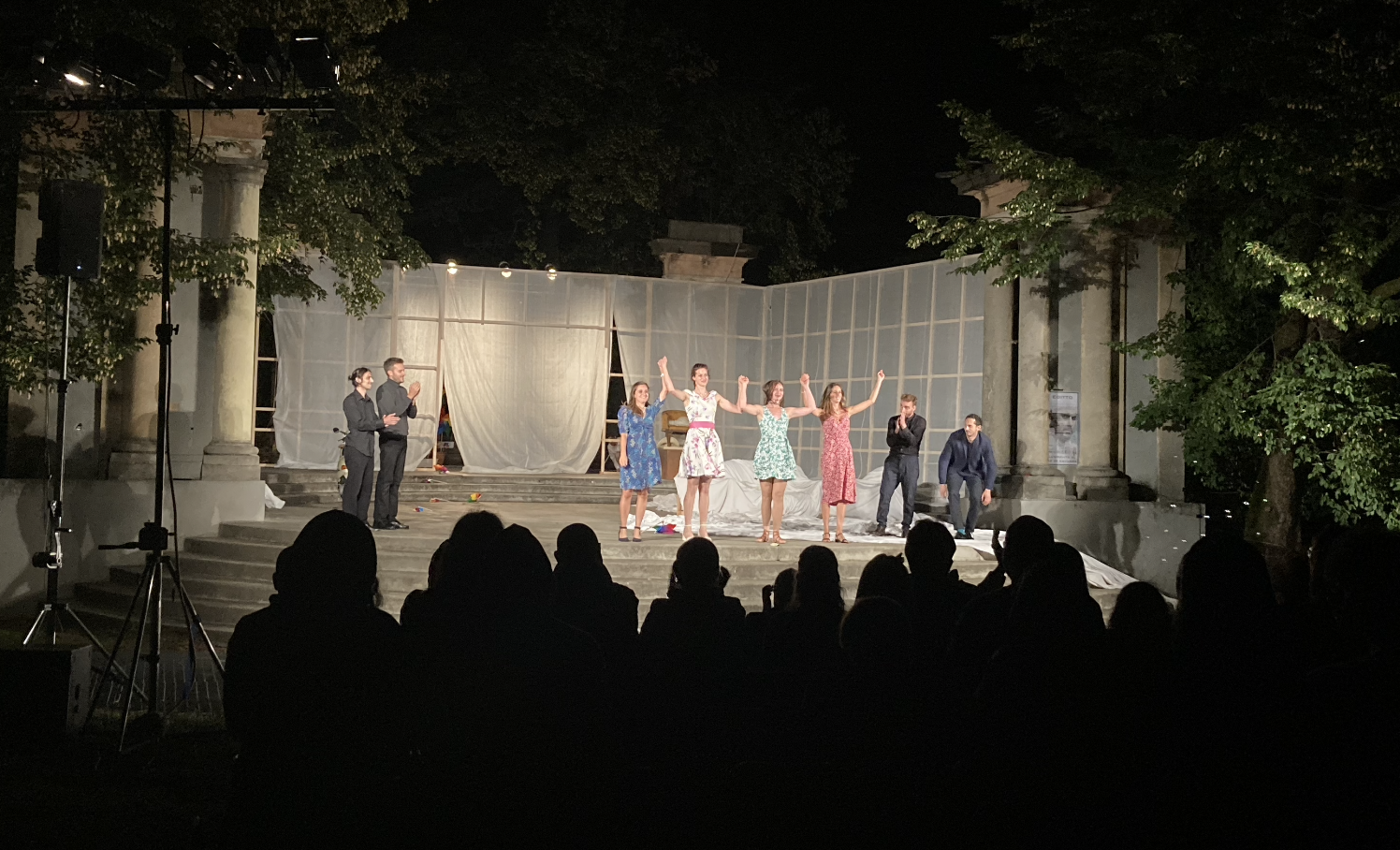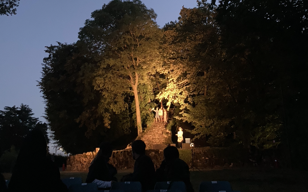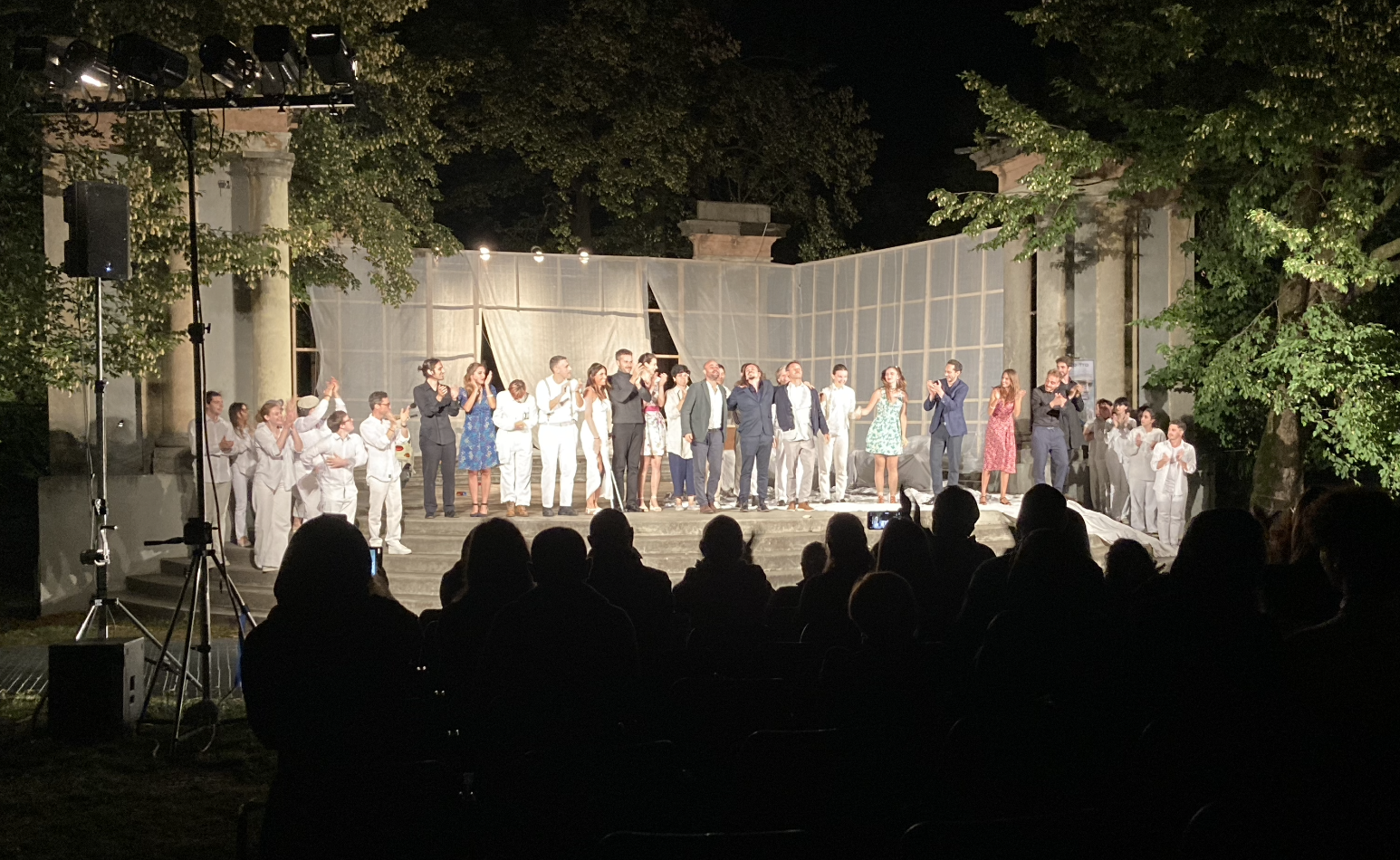 Scordatevi Shakespeare. Nel senso che, se avete un’idea classica, con abiti seicenteschi, e linguaggio aulico e poetico, la fedeltà al testo scritto dal bardo… no. Quello che ieri è andato in scena al Teatro Licinium è molto moderno, non così tanto da risultare criptico intesi, è divertente, con contaminazioni poetiche Angioinesche e Tozziane (ma queste le capirete solo andandolo a vedere) al ritmo dei Gipsy King. Non voglio né fare il critico teatrale, che non è mia competenza né capacità, né voglio anticiparvi troppo di quel che vi invito ad andare ASSOLUTAMENTE a vedere. La commedia è piacevole, si ride parecchio, bravi tutti gli attori, sia i professionisti che gli allievi della Scuola Teatro de Il Giardino delle Ore. Ora, ripeto non è mio mestiere fare il critico, per non sbagliare citerò, in modo casuale e sbagliando quasi certamente, attori e personaggi: bravi tutti davvero, ma se dovessi metter un PIU’ a qualcuno su un’ipotetica pagella li metterei ai registi, all’ottimo re e ai divertenti Marco Ripoldi e Zucca (o Zuppa?). Menzione speciale al ‘nostro’ Alessandro Botta. Le ragazze invece? Stupende tutte, la principessa e le sue dame sono un mix perfetto di sofisticata e divertente antipatia. Precisa e degna di nota anche Gloria Giacopini al seguito delle dame. Passiamo alle note dolenti: che freddo maledetto! Il clima è stato certamente poco confortevole, ma era la prima, ci dovevamo essere! e gli eroi quindi ci sono stati sia sul palco che tra il pubblico. La pausa tra primo e secondo atto è sembrata più un’operazione della Protezione Civile… ammassati per il tè e la grappa all’angolo bar cercando di riscaldarsi, gente che si abbracciava avvolti in plaid recuperati dalle auto al volo. Il tutto a creare comunque un gran bel clima di amore per il teatro. Le prossime date saranno sicuramente fresche e piacevoli (ma portatevi uno scialle lo stesso, consiglio appassionato). Impagabile il ritrovarsi fisicamente ancora dopo questi periodi sotto un cielo magico e davanti ad attori appassionati…
