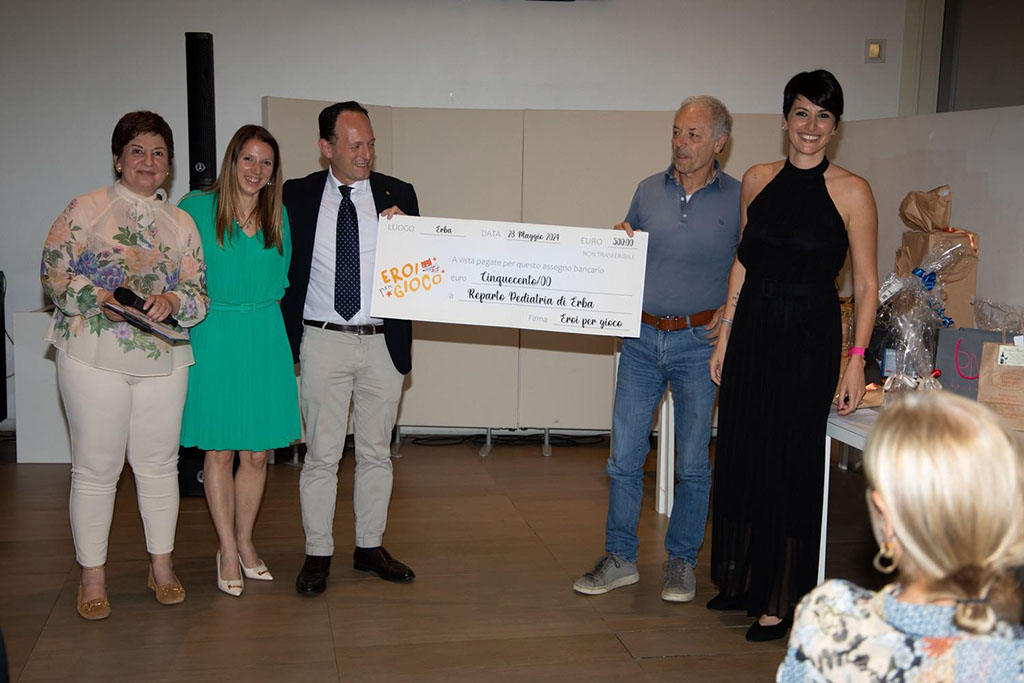 Inoltre sono stati donati € 1.000 al Reparto di Pediatria dell’Ospedale di Erba; in principio gli Eroi per Gioco avevano deciso di donare simbolicamente le prime venti quote associative per un totale di 500 euro, ma durante la serata un donatore, che vuole rimanere anonimo, ha effettuato un bonifico istantaneo permettendo così agli Eroi di modificare in diretta l’assegno ed innalzarlo a € 1.000.